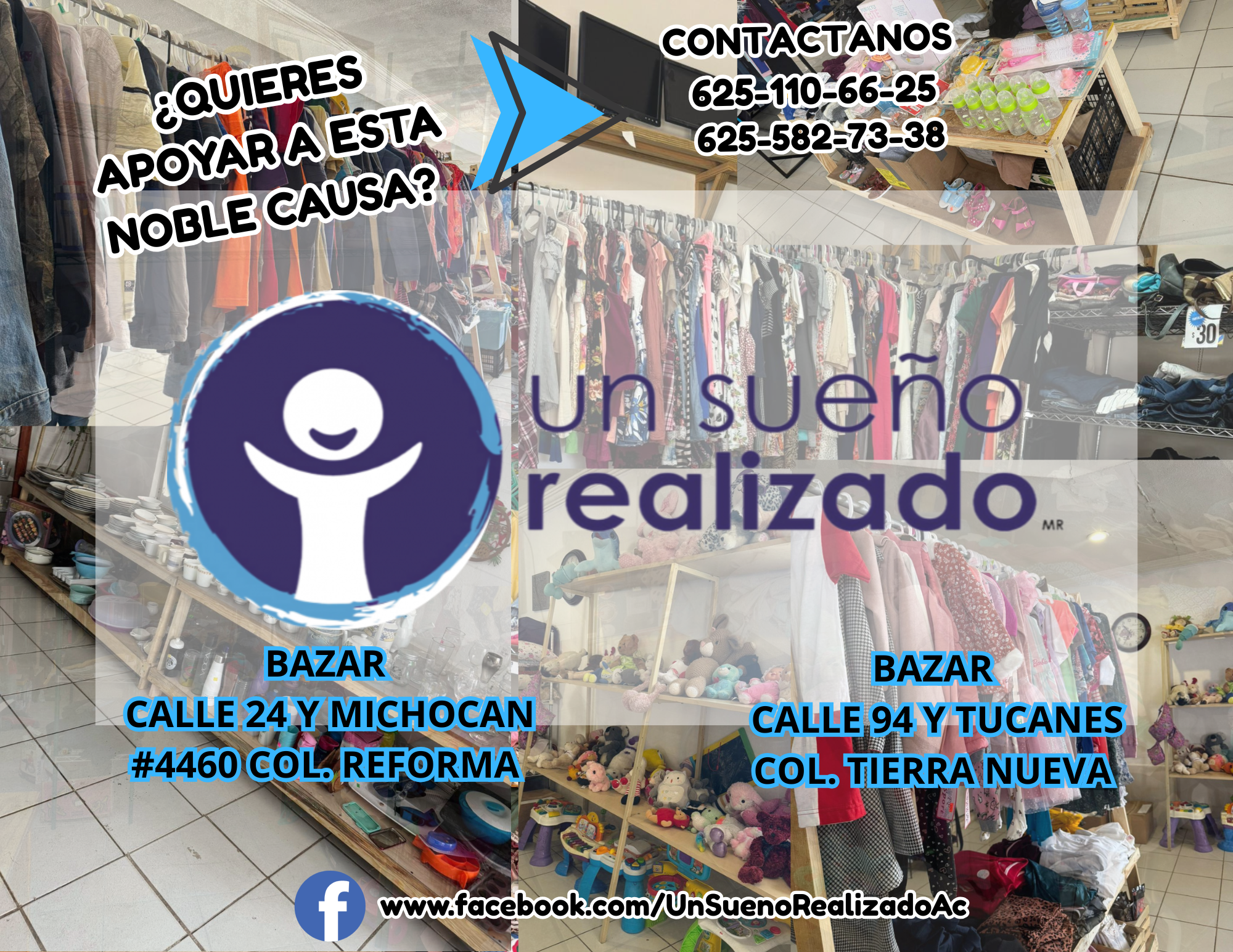 El Bazar Un sueño Realizado, Nace de la necesidad de la Asociación para recabar fondos para la misma, recibimos donativos de personas de la ciudad, comunidad menonita, así mismo realizamos viajes a Canadá, en donde iglesias de ese país, hacen colectas de mercancía variada para la asociación.